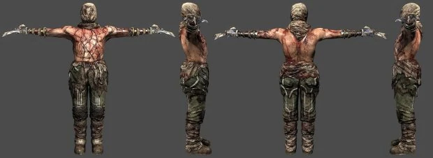 Scraper haben sich ihre Zeremoniekaputzen über die Köpfe gezogen und die Hände vom Propheten als Opfergabe entfernen lassen. Ihre Hände wurden durch improvisatorische Krallen à drei Klingen ersetzt. Während des Rituals verstümmelten sie sich durch ihren Klingen (wahrscheinlich) gegenseitig, wodurch ihre gesamten Oberkörper mit tiefen Schnitten übersät sind. Von der Brust bis zum Bauch überzieht ihren Oberkörper ein ins Fleisch geschnittenes Markersymbol ihre Erscheinung. Durch die Verstümmelung hängt der obere Teil ihrer Kampfanzüge in Fetzen herunter. Die Zeremoniekaputze weißt vereinzelte Blutflecken im Bereich des Gesichtes auf. Gut möglich das Scraper nicht nur ihre Hände der „neuen“ Church gespendet haben sondern auch Zunge, Ohren, Nase und Augen, was die Blutflecken erklären würde. Auch ist der Kaputzenkragen am Hals vollkommen blutdurchtränkt. Interessanterweise tragen alle Scraper ausnahmslos, eine dunkelgrünen Hose mit schwarzen Knieschützern. Diese wurden nur von den Schrotflinten-Soldaten verwendet. Scraper trifft der Spieler überwiegend in ihrer rituellen Haltung an, während sie ihr Mantra vor sich hinmurmeln. Scraper verehren die Nekromorphs als Götter, weshalb sie ihre gefallenen Brüder, die in Slasher verwandelt worden, festlich aufgestellt haben. Verfehlen Scraper Isaac/Carver schlagen sie frustiert mit den Krallen auf den Boden und stürmen erneut auf ihn zu. Wörter können sie scheinbar nicht mehr von sich geben (ohne Zunge verständlich), stattdessen grunzen und schreien sie, dennoch klingt dies immer noch "menschlicher" als das, was so mancher Nekromorphs von sich gibt...