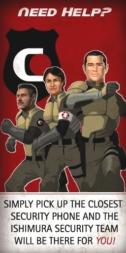 "Besoin d'aide ? Saisissez le téléphone de sécurité le plus proche et l'équipe de sécurité de l'Ishimura sera là pour VOUS !"