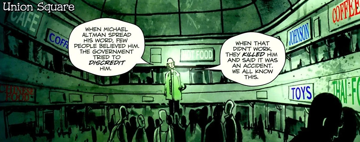 La Place est particulièrement utilisée par la communauté unitologue de la Colonie en 2508. Deakin Abbott se rend en effet là-bas suite à la découverte du Monolithe 3A pour prêcher ses discours unitologues à ses "frères" et "sœurs". Quelques jours plus tard les unitologues quittent la Place de l'Union, préférant se rendre directement auprès de leur artefact divin.