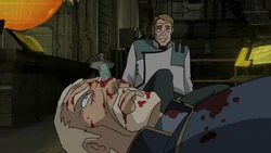 Дальнейшая сцена различается в игре и фильме, но исход один и тот же. Кайн намеренно или случайно вонзает шприц в глаз капитану, тем самым убивая его. Члены экипажа собираются арестовать Кайна, но тот, воспользовавшись переполохом на мостике, спасается бегством. Понимая, что Обелиск ни в коем случае не должен достичь обитаемых миров, он начинает саботировать системы корабля. Кайн повреждает один из челноков, вытаскивая из него навигационные карты, а затем отправляется в инженерный отсек. Там он пытается нарушить работу гравитационной центрифуги, но его останавливает начальница службы безопасности Алисса Винсент. В ходе противостояния Кайн сбегает, прихватив плазменную пилу девушки.