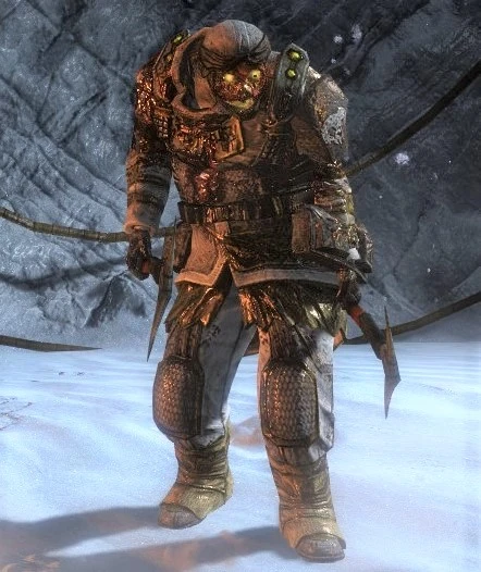 The S.C.A.F. Research Team variant is encountered only in the labs of the S.C.A.F. mountain peak base. Their hosts were once wearing uniforms which closely resemble those of Snow Prospectors, however, it's coloration is different being Blue-And-White jackets instead of Black-And-Yellow. Their hosts were also wearing masks with glass visors and peculiar filters. After mutation the visor part of their masks is broken and their uniforms are splattered in slime. The slime in their mouths can be seen pulsating through the filter. They wield a pair of saws that were most likely used to slice through Alien specimens.