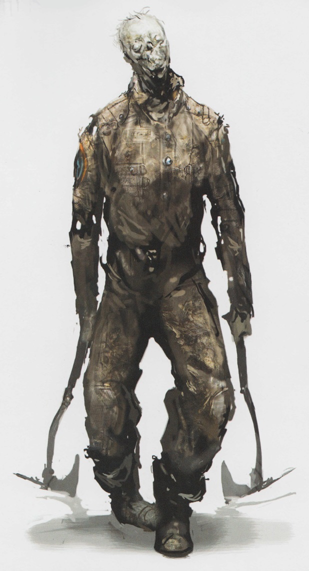 These Wasters were made out of recently deceased S.C.A.F. Pilots. Their hosts were equipped with green uniforms that covered most of their bodies leaving only their arms open to the elbows. They're coated in blood and slime and they lack some skin on their faces, exposing face muscles. They were presumed to be exclusively as the pilots of wrecked Mule, however, 200 years after the game's prologue that variant is encountered by Isaac Clarke on Tau Volantis which is most likely an overlook by developers since these Necromorphs retained their fresh condition even after 200 years.