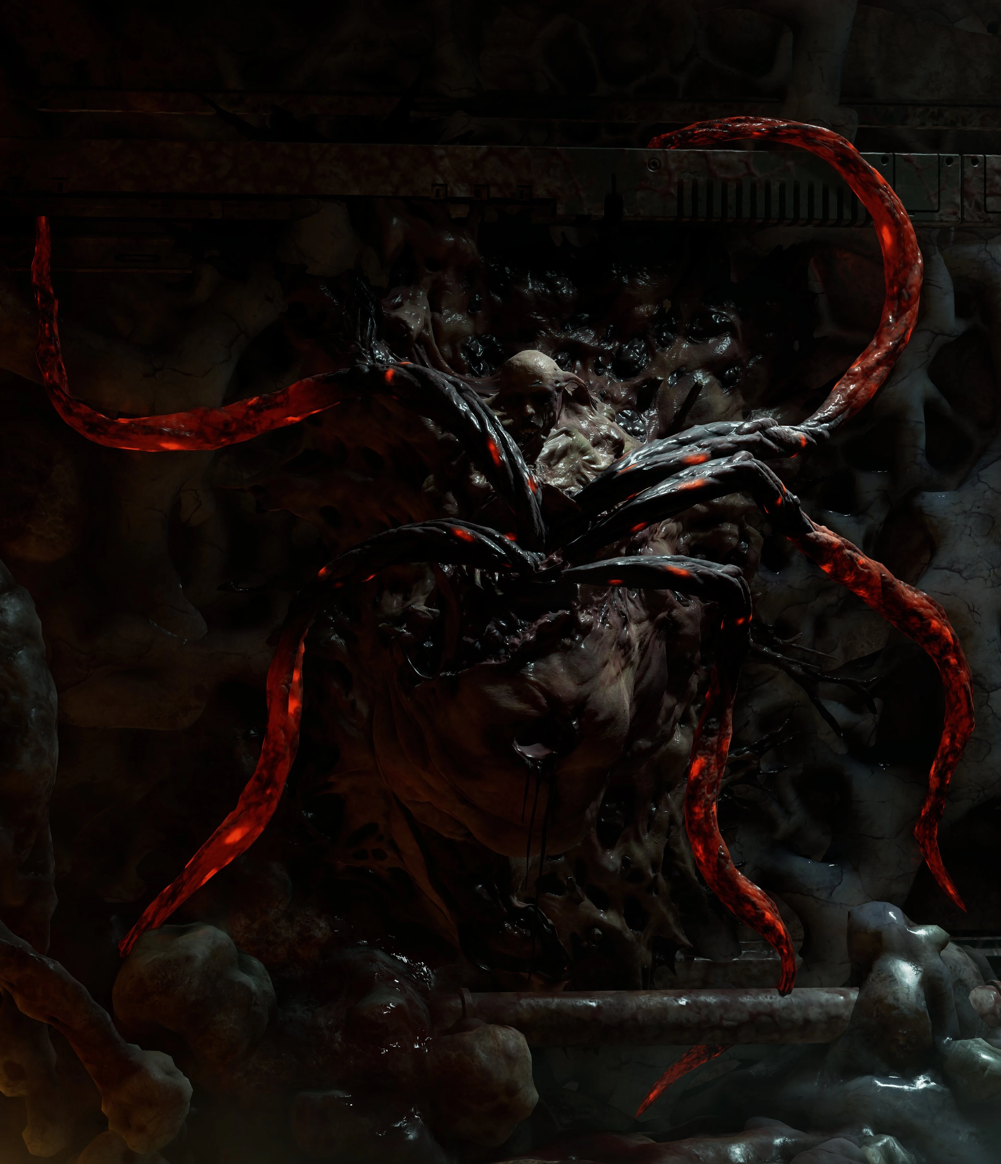 The thoracic cavity now serves as a place for the newly created tentacle appendages to rest. The creature has two kinds of said appendages; the first kind are the appendages that are used to further anchor the creature on their spot and are instantly drawn out once the Guardian has spotted a hostile in their vicinity, while the second kind is a single scythe-tipped tentacle that serves as the creature's only means of attack in close quarters and is what makes the Guardian extremely lethal.