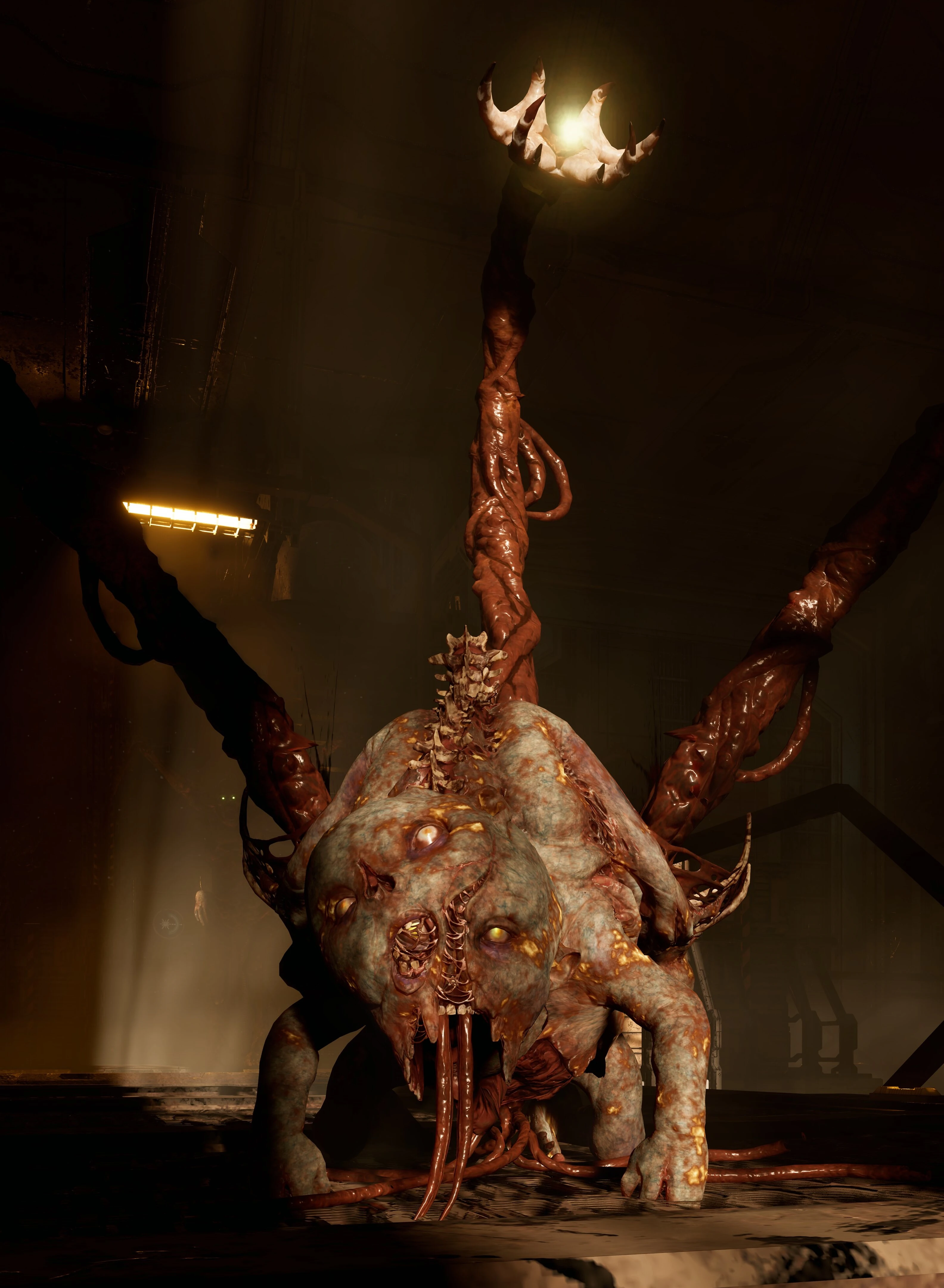 Lurkers are an extensively mutated Necromorph form, sporting a number of adaptations to facilitate ranged and low-gravity combat. Lacking both the coordination and muscle mass demanded to efficiently kill, the unlucky victims and corpses transformed into a Lurker are treated more like a lump of biomass than an existing template, around which the pathogen recombines it into an offensive form.