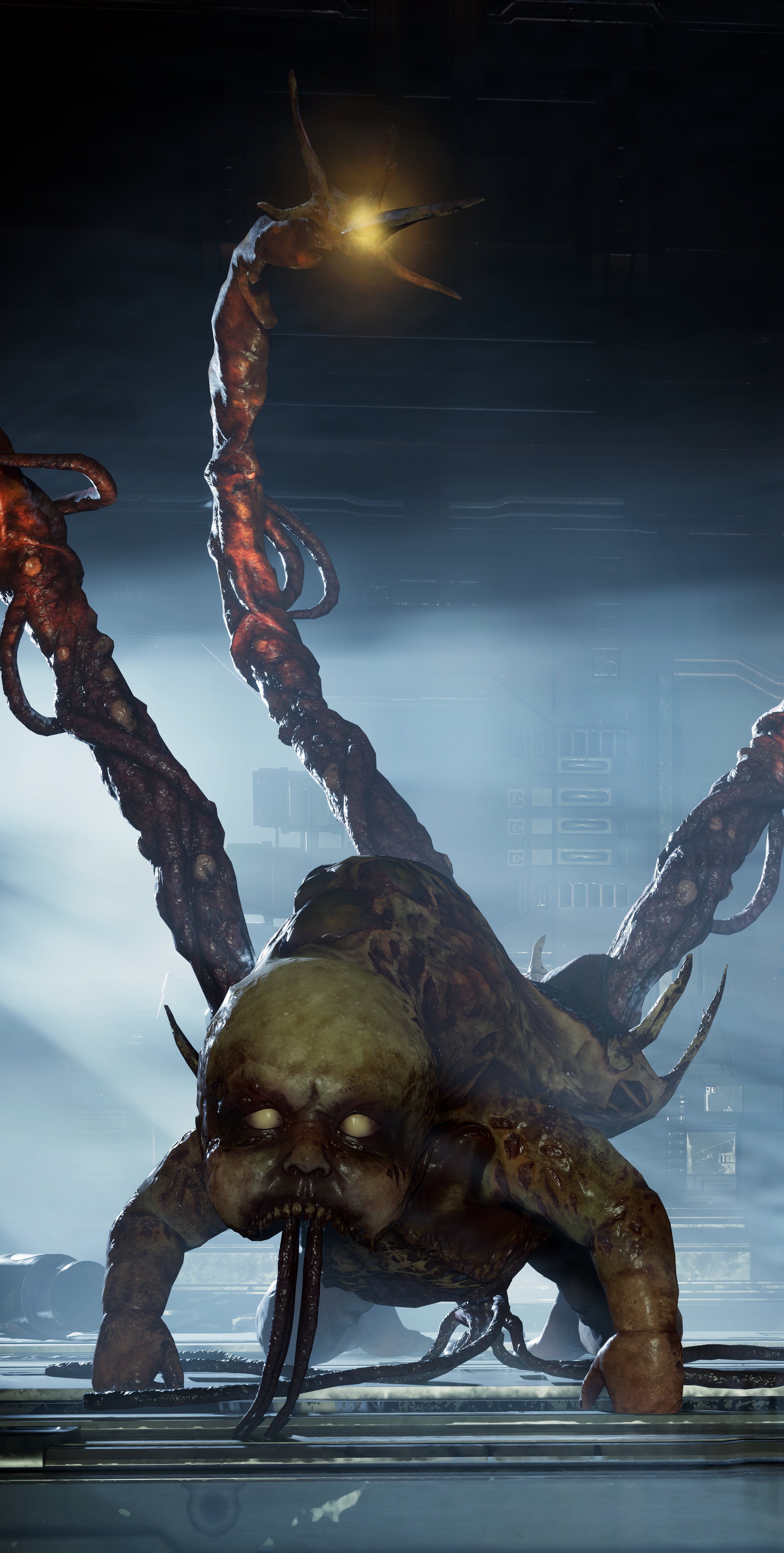 Lurkers are an extensively mutated Necromorph form, sporting a number of adaptations to facilitate ranged and low-gravity combat. Lacking both the coordination and muscle mass demanded to efficiently kill, the unlucky victims and corpses transformed into a Lurker are treated more like a lump of biomass than an existing template, around which the pathogen recombines it into an offensive form.