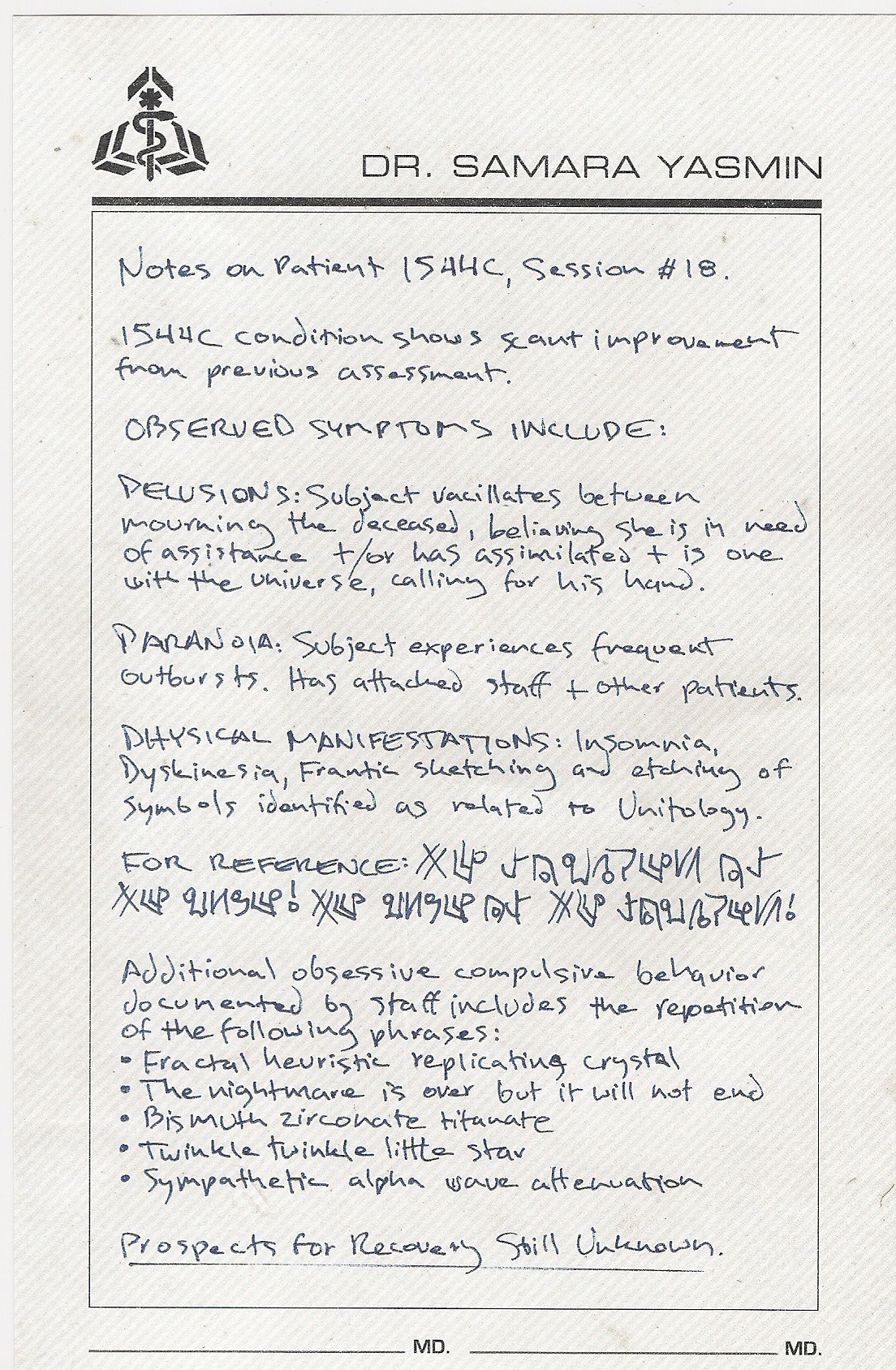 - "I can't stop thinking about the formulas from Patient 4's last session. They are so clearly ordered, they keep playing back in my mind. The final configuration seems within reach, I could almost solve it myself. It's funny, I was telling Travis the other day that it's almost like it "wants" us to succeed. I've never seen anything like it. Once we finally solve this heuristic stabilization problem, we should be able to start growing the layers of the Marker from the mineral baths."