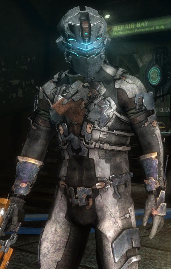 The suit itself is a weathered and rusty version of the Advanced Suit from Dead Space 2. Despite being a state-of-the-art suit around the events of the Titan Station outbreak, it now seems to be much more distressed and shows signs of heavy wear from the years since then. While there is no actual lore reason for the suit's wear, one can deduce that it is a result of the damage the suit sustained from the events leading up to Dead Space 3. Still, Isaac has never made mention of disposing of the suit at any point in the franchise, making it plausible that he could have held onto it since then.