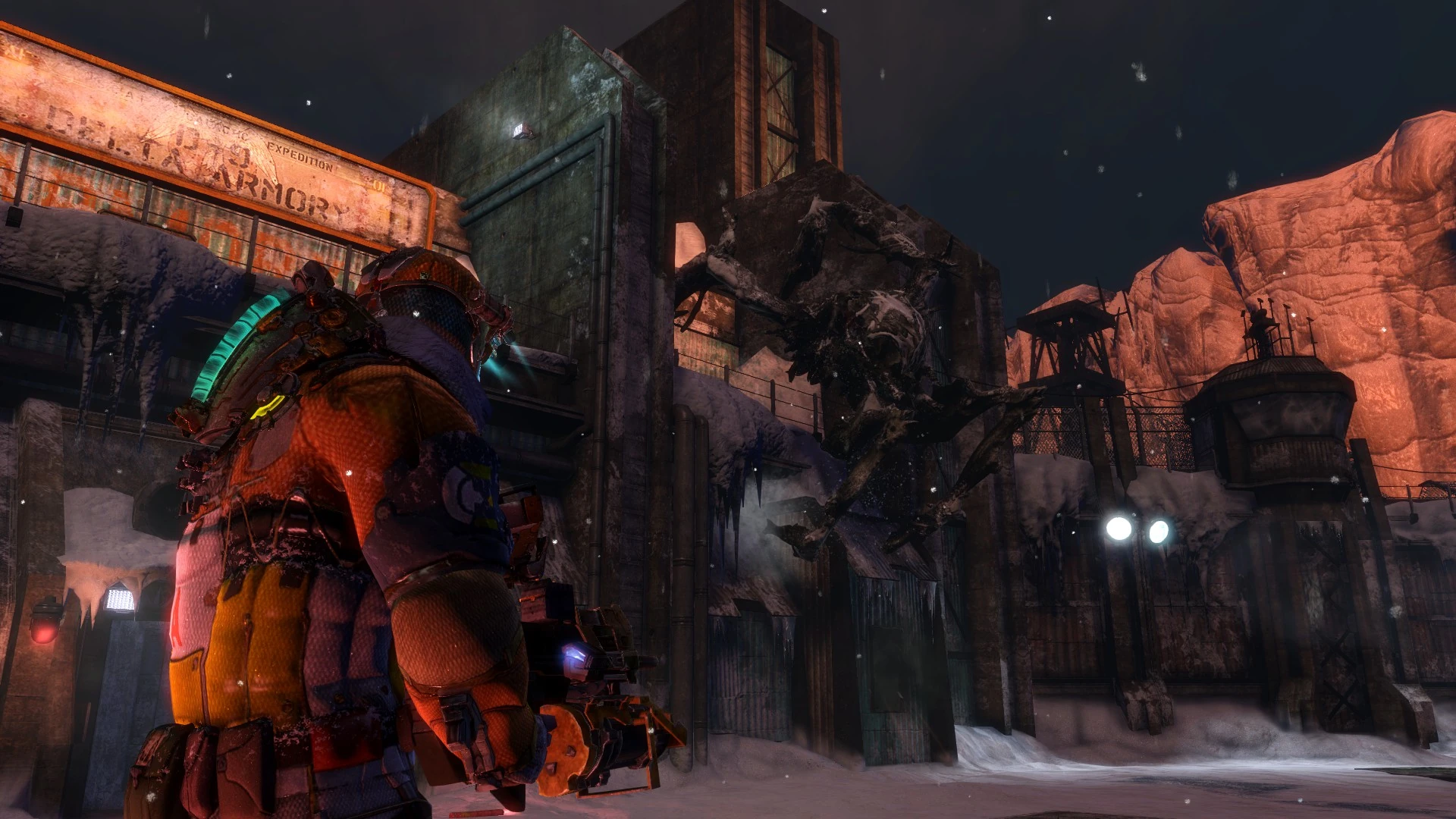 The Snow Beast is first encountered in Chapter 8 after the crash on Tau Volantis, when Isaac and Carver follow the trail of flares left by Ellie. The Necromorph appears suddenly from a cliff, knocking them down to the bottom of the cliff. When they get up, the Snow Beast is nowhere to be found although its roar can be heard whilst they are exploring the area and it can be briefly seen climbing on the outside of the buildings around the pipeline, suggesting that it is stalking Isaac and Carver.