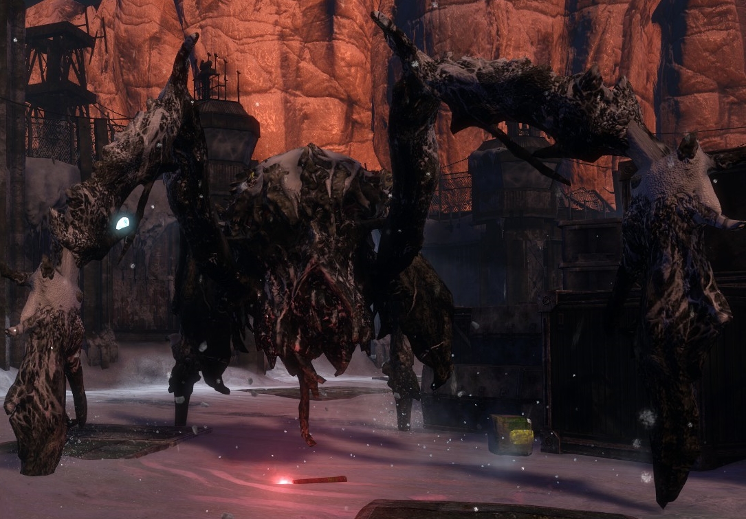 Because of its large size (approximately 14 feet tall), the Snow Beast is very likely a Necromorph version of a crustacean that lived thousands of years ago in the depths of the oceans of Tau Volantis when the planet was still liquid.[1] It uses its long tentacles and incredibly fast tongue to catch prey. It has yellowish tissues on its back tentacles, which are particularly vulnerable to damage. If these tentacles are dismembered, a secondary set of tentacles appears which, when fired upon, critically damages the Snow Beast but regenerates over time.